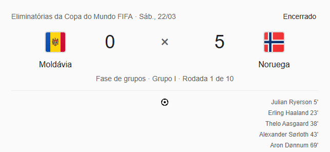 O placar foi inaugurado aos cinco minutos com Ryerson, e Haaland ampliou aos 23, marcando seu 39º gol pela seleção em 40 jogos. A primeira etapa ainda teve gols de Aasgaard, aos 38, e Sorloth, aos 43, após assistência de Martin Ødegaard. No segundo tempo, Dønnum fechou a conta aos 69 minutos. O domínio norueguês foi absoluto: 59% de posse de bola, 24 finalizações e nenhuma chance real cedida à Moldávia, que terminou a partida sem um chute sequer na direção do gol.